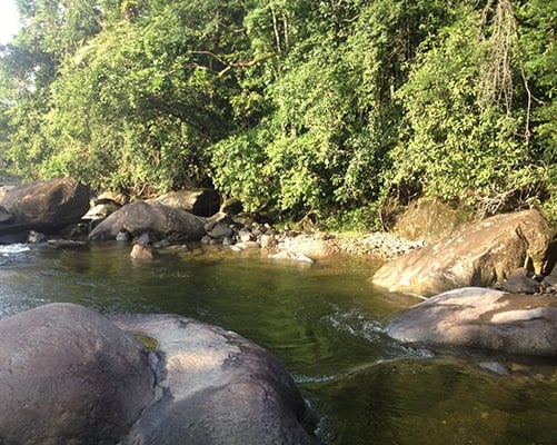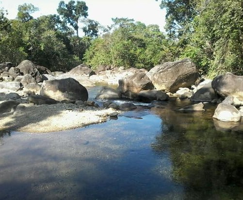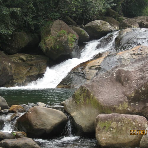 Suas águas vem do Rio Itinguçú e possui uma grande piscina natural de águas cristalinas e em seu entorno a beleza exuberante da mata da Juréia.