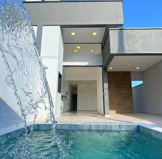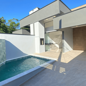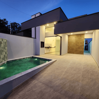 Esta casa está em um terreno de 150m² e possui uma área construída de 85m², distribuídos em 2 dormitórios, sendo 1 suíte, banheiro social, sala para 2 ambientes e cozinha americana integrada com a área de lazer (churrasqueira e piscina com cascata em inox).