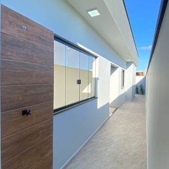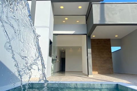 Com design moderno e materiais de primeira linha, conta com o piso de toda a casa em porcelanato, iluminação de LED embutida em todos os cômodos, nos banheiros box blindex, pia com a cuba esculpida no próprio granito, paredes em porcelanato. Na cozinha pia em granito Ubatuba com escorredor de louça embutido e torre de energia controlada por controle remoto.