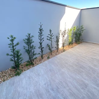 No quintal, lavanderia coberta, local para chuveiro pós praia com área revestida em porcelanato padrão madeira e nos fundos pequeno jardim dão um chame quando visto pela janelas dos quartos.